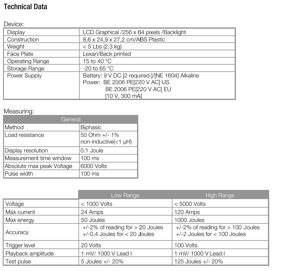 📋 »ó¼¼ »ç¾ç (Specification) SECULIFE DFPRO´Â ¿ÜºÎÇü Á¦¼¼µ¿±âÀÇ ±â´É Å×½ºÆ®¸¦ À§ÇÑ ÀåºñÀÔ´Ï´Ù. ÀÎü ÀÓÇÇ´ø½º¿Í À¯»çÇÑ 50¥Ø(¿È)ÀÇ ³»Àå ½Ã¹Ä·¹ÀÌ¼Ç ºÎÇϸ¦ ÅëÇØ ¹æÃâµÈ ¿¡³ÊÁö¸¦ ÃøÁ¤ÇÕ´Ï´Ù. ¶ÇÇÑ, ¿øÇÏ´Â ÆÄÇü°ú ½ÃÇè µ¥ÀÌÅ͸¦ ½Å¼ÓÇÏ°Ô È®ÀÎÇÏ°í ¼±ÅÃÇÒ ¼ö ÀÖ½À´Ï´Ù. ÇöÀç ÆÞ½º¸¦ °áÁ¤Çϱâ À§ÇØ ºÎÁ¤¸Æ ¹× Àü·Â ÆÄÇüÀÌ Æ÷ÇÔµÈ 12¸®µå ECG¸¦ »ç¿ëÇÒ ¼ö ÀÖÀ¸¸ç, ÇØ´ç µ¥ÀÌÅÍ´Â Á¦¼¼µ¿±âÀÇ µð½ºÇ÷¹ÀÌ¿¡¼ ±â·Ï ¹× È®ÀÎÀÌ °¡´ÉÇÕ´Ï´Ù. SECULIFE DFPRO¸¦ ÅëÇØ »ç¿ëÀÚ´Â ÃÖ´ë **50°³ÀÇ »çÀü ÇÁ·Î±×·¡¹ÖµÈ ½ÃÇè ½ÃÄö½º(Auto Sequences)**¸¦ ½ÇÇàÇÒ ¼ö ÀÖ½À´Ï´Ù. ¸ðµç Å×½ºÆ® ¼³Á¤Àº »ç¿ëÇϱ⠽¬¿î PC ÇÁ·Î±×·¥À» ÅëÇØ ±¸¼ºµË´Ï´Ù. ⏱ ÆÞ½º Áö¿¬ ½Ã°£ – ECG ÆÞ½º »ý¼º (Pulse delay time) µ¿±âÇü Á¦¼¼µ¿(Synchronous defibrillation) ¸ðµå¿¡¼, Á¦¼¼µ¿±âÀÇ Àü·ù ÆÞ½º´Â ECGÀÇ RÆÄ(R-wave)¸¦ °¨ÁöÇÑ Á÷ÈÄ¿¡ Æ®¸®°ÅµË´Ï´Ù. À̶§ ÃøÁ¤µÇ´Â ÇÙ½É ÁöÇ¥ÀÎ **'ÆÞ½º Áö¿¬ ½Ã°£'**Àº RÆÄÀÇ ¹ß»ý ½ÃÁ¡°ú Á¦¼¼µ¿±â ÆÞ½ºÀÇ ÇÇÅ©(Peak) ½ÃÁ¡ »çÀÌÀÇ ÃÖ´ë ½Ã°£ Â÷ÀÌ·Î Á¤Àǵ˴ϴÙ. |