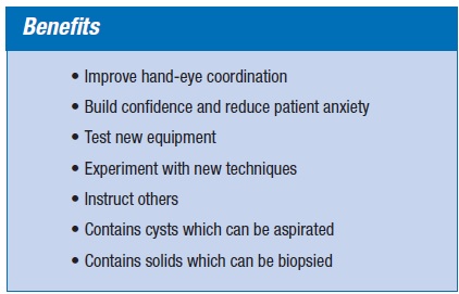 ![]() ¸ðµ¨ 052A, ºñÁ¤Áú º´º¯°ú ÃÊÀ½ÆÄ ´Ïµé À¯¹æ »ý°Ë ÆÒÅÒÀº ÃÊÀ½ÆÄ À¯µµ ¹Ù´Ã »ý°Ë ÈÆ·Ã°ú ½ÇÇèÀ» À§ÇØ Æ¯º°È÷ ¼³°èµÇ¾ú½À´Ï´Ù. Æ÷ÇÔ µÈ ´ë»óÀÇ ºñ ±¸ÇüÀº 2D, 3D ¹× 4D ¿µ»ó ȹµæ°ú ¿¬½ÀÀ» ÇÒ ¼ö ÀÖ½À´Ï´Ù. The Model 052A, Ultrasound Needle Breast Biopsy Phantom with Amorphous Lesions, was designed specifically for ultrasound-guided needle biopsy training and experimentation. The non-spherical shape of the embedded targets enable practice with 2D, 3D and 4D image acquisition. The Model 052A accurately mimics the ultrasonic characteristics of tissues found in the average human breast. The size and shape of the phantom simulates that of an average patient in the supine position. Within each phantom, there are six cystic masses and six dense masses which are randomly positioned. Because it is constructed of a self-healing formulation of Zerdine¢ç, the phantom will allow multiple biopsy insertions with minimal needling tracking. Needle tracks will usually disappear within minutes (sometime seconds) of needle removal. Each cystic mass may be aspirated once and each dense mass may be biopsied multiple times. A special holding tray facilitates proper hand position during the training procedures. ![]() ![]() |